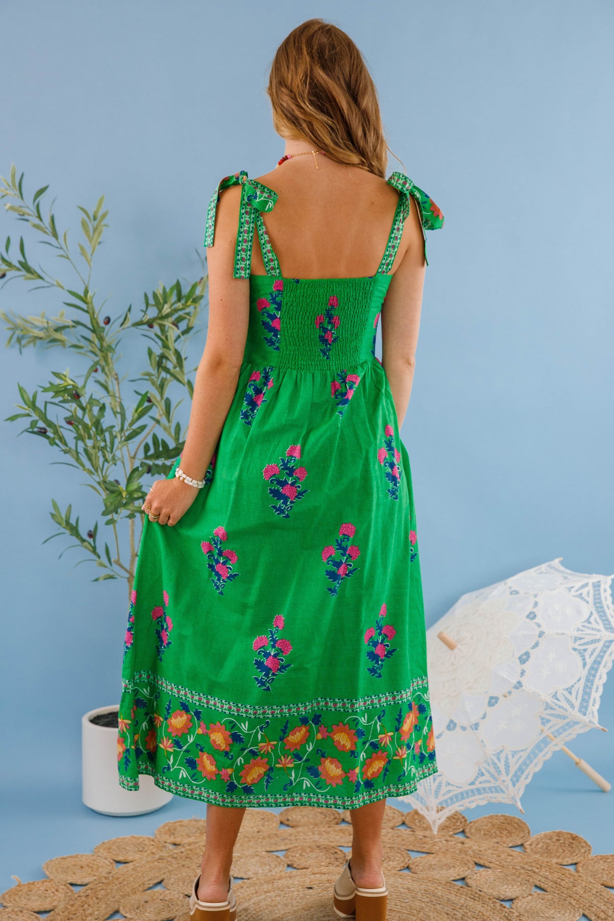 Embrace effortless style with the Life On the Lake Midi Dress! Its flattering midi length and boho-inspired design make it ideal for any occasion. Playful tie straps and a smocked back ensure a comfortable, adjustable fit, while the button-down front adds a charming detail. In a fresh green hue, this dress invites you to channel your inner flower child and stand out with natural, carefree elegance!
