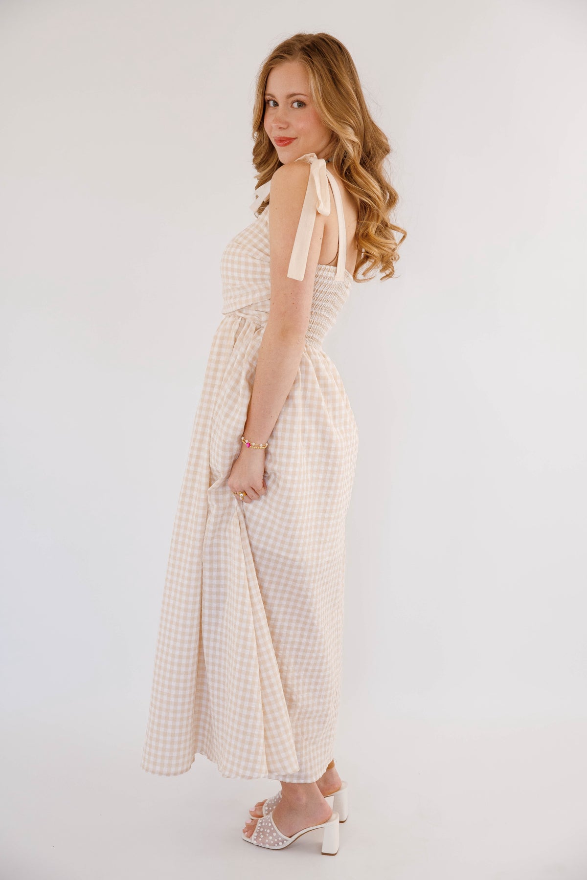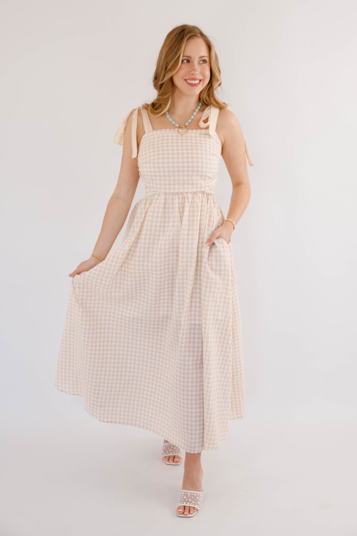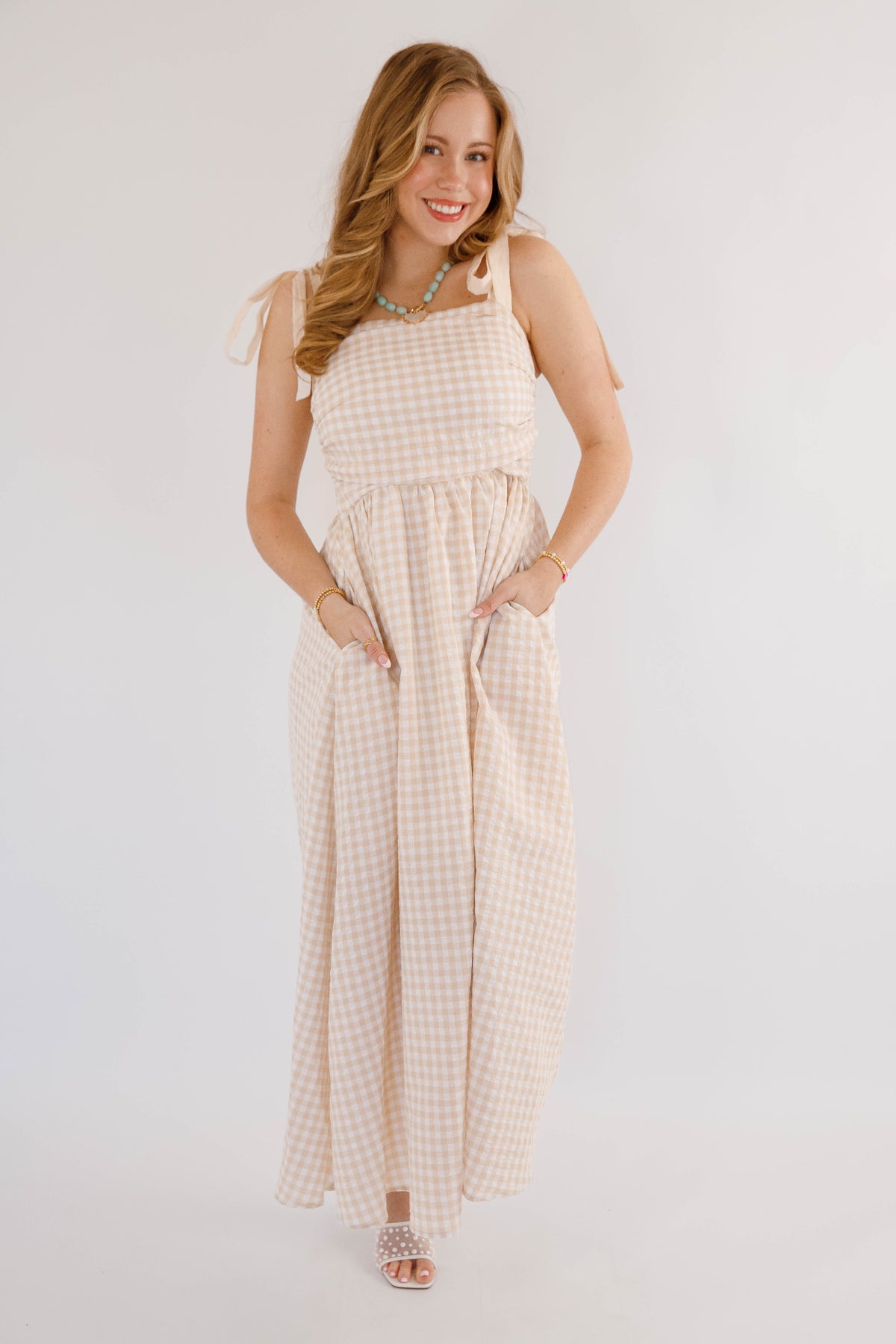 Effortless elegance meets practical style in this beige gingham maxi dress. Featuring charming tie straps and a flattering smocked back, this piece offers both comfort and sophistication. Side pockets provide convenience, while a hidden side zipper ensures a seamless silhouette. Perfect for garden parties, casual outings, or relaxed weekend wear.