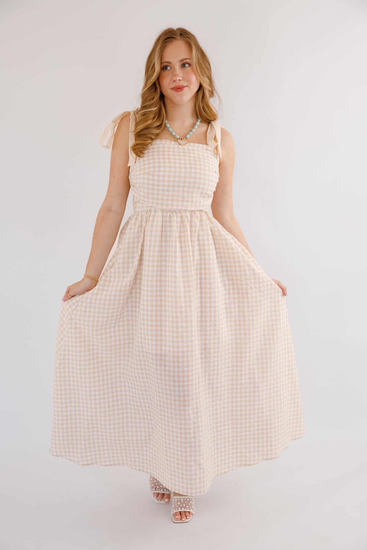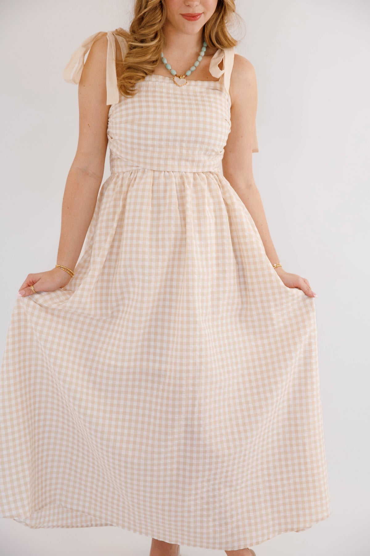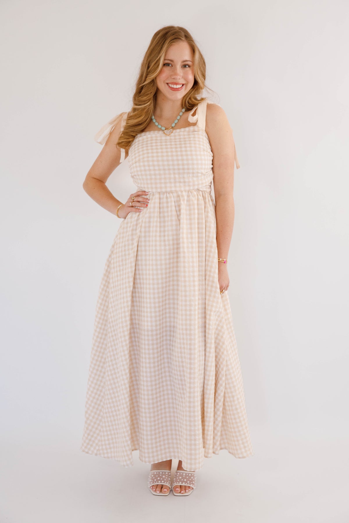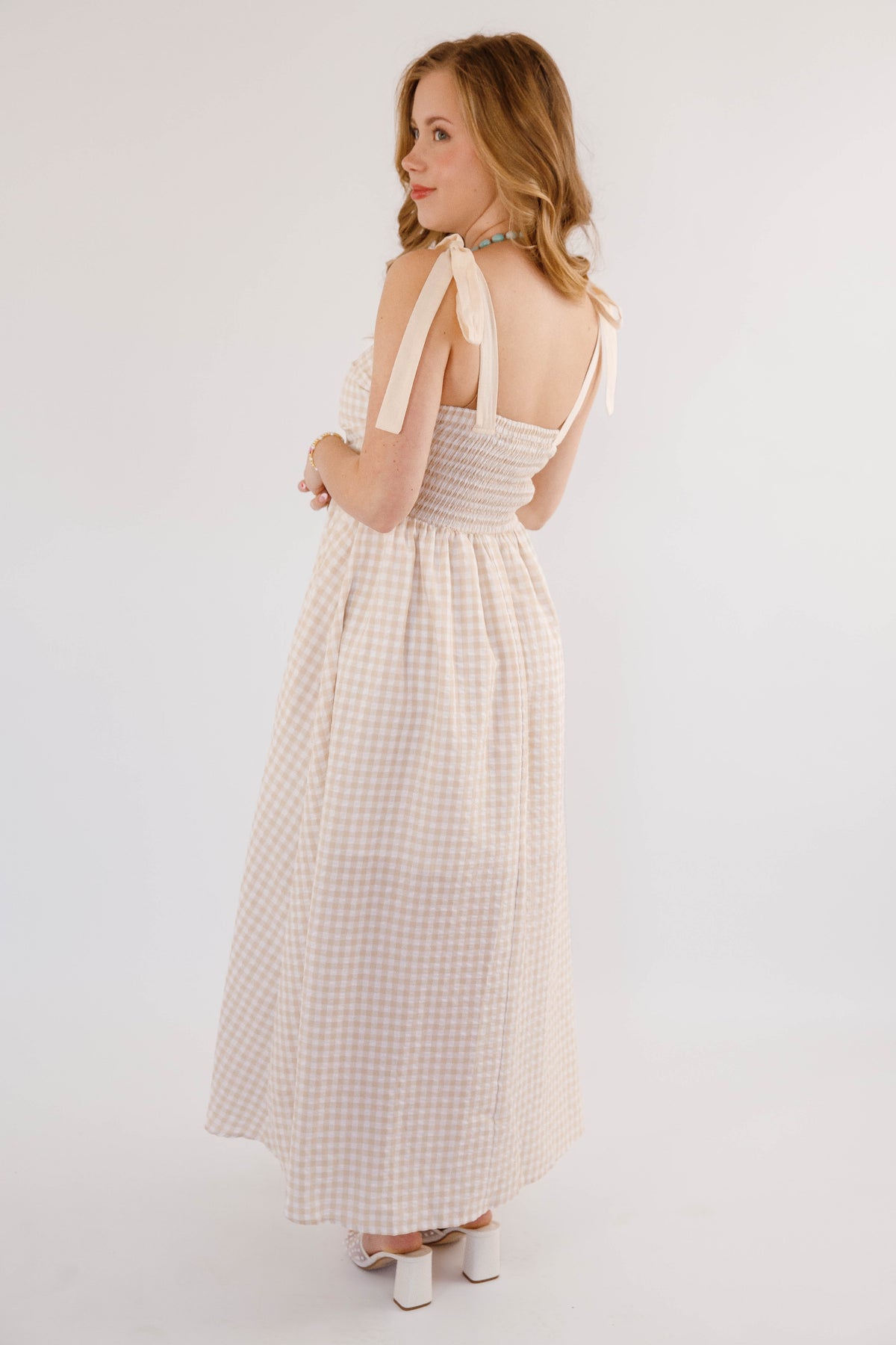 Effortless elegance meets practical style in this beige gingham maxi dress. Featuring charming tie straps and a flattering smocked back, this piece offers both comfort and sophistication. Side pockets provide convenience, while a hidden side zipper ensures a seamless silhouette. Perfect for garden parties, casual outings, or relaxed weekend wear.