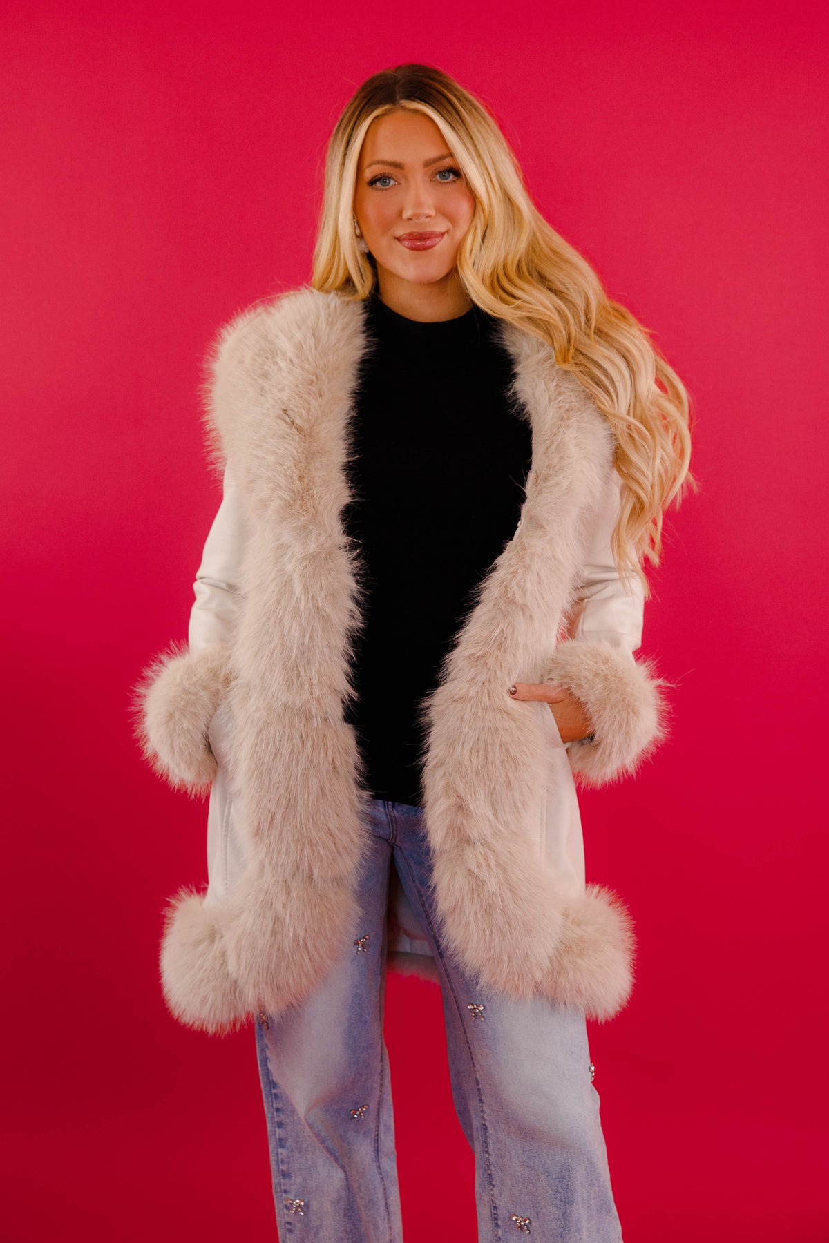 Elevate your winter wardrobe with this stunning faux cream leather coat, designed to turn heads wherever you go. The luxurious faux fur trim adds an undeniable touch of sophistication, while the included belt cinches your silhouette for a flattering, polished look. Crafted from premium faux leather, this coat delivers the upscale aesthetic of genuine leather without compromise. Perfect for chic city strolls or après-ski moments, it's the versatile piece you'll reach for again and again. Make a statement this season with timeless elegance and modern style. Belt length: 69"