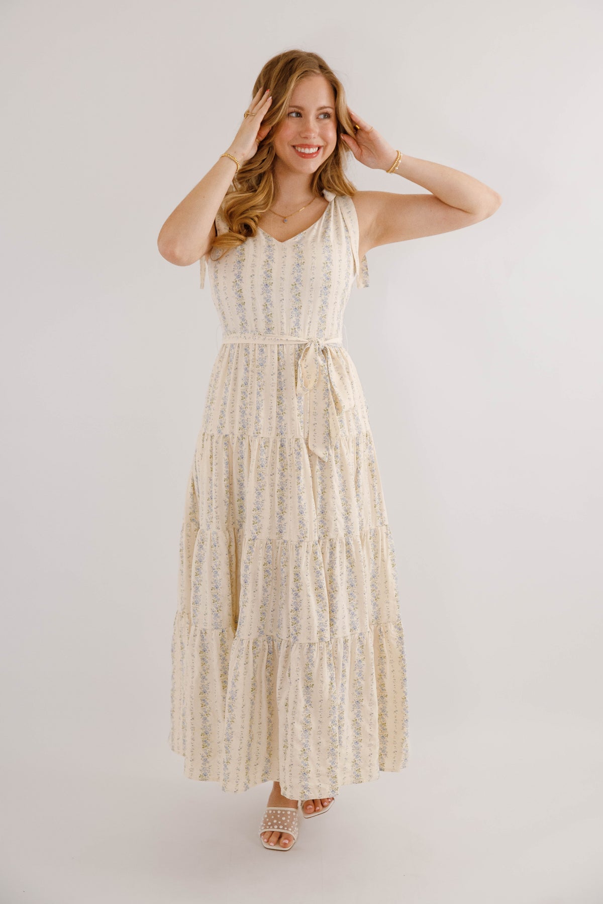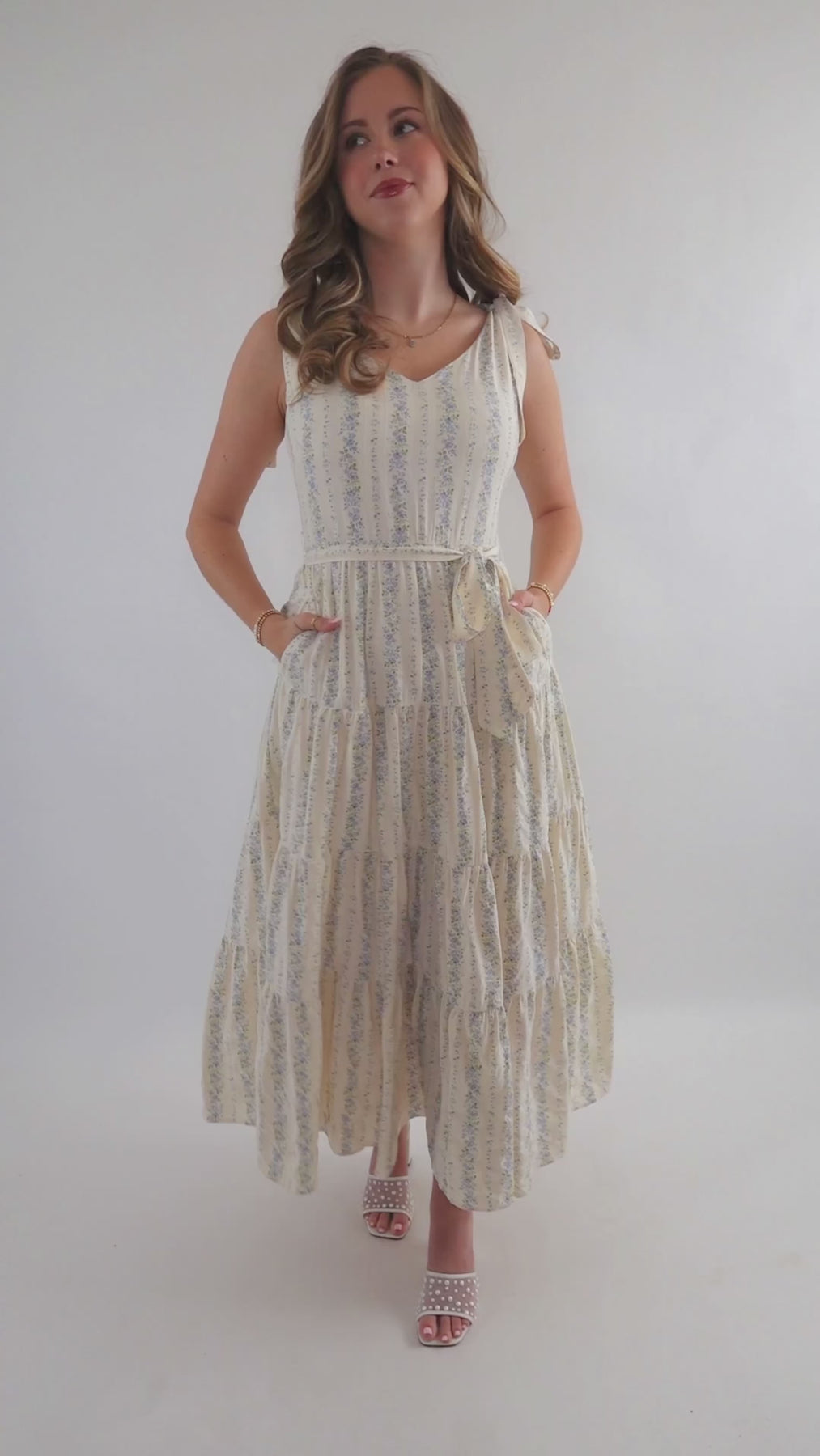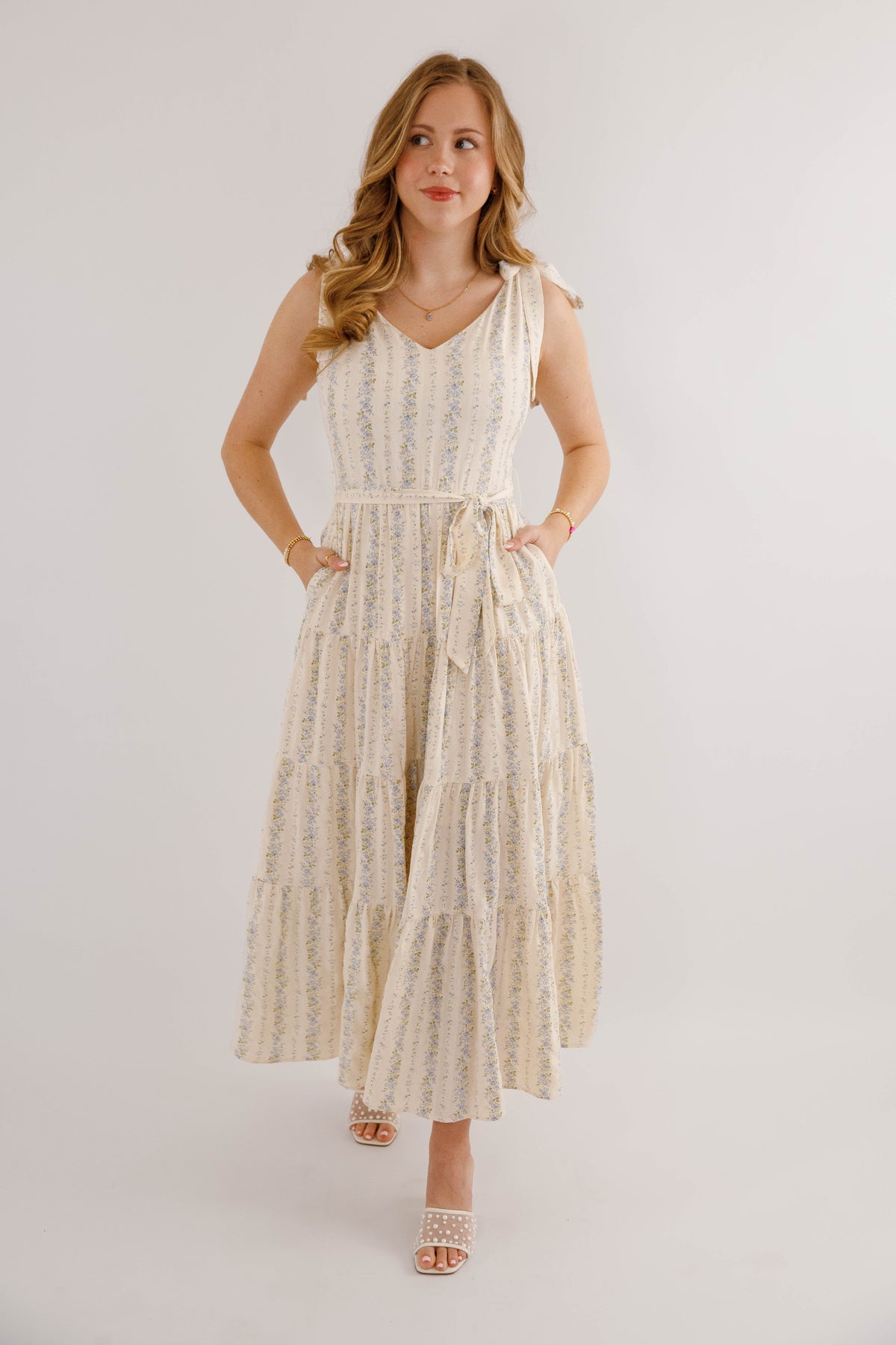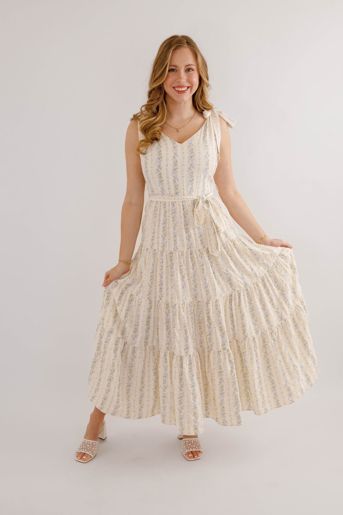 Embrace effortless spring style with this charming blue striped floral maxi dress. Featuring a romantic tiered skirt and adjustable tie straps, it offers a flattering silhouette enhanced by a cinched waist tie. The hidden side zipper ensures a seamless look, while the structured fabric provides a polished finish. Perfect for garden parties, weddings, or casual outings.