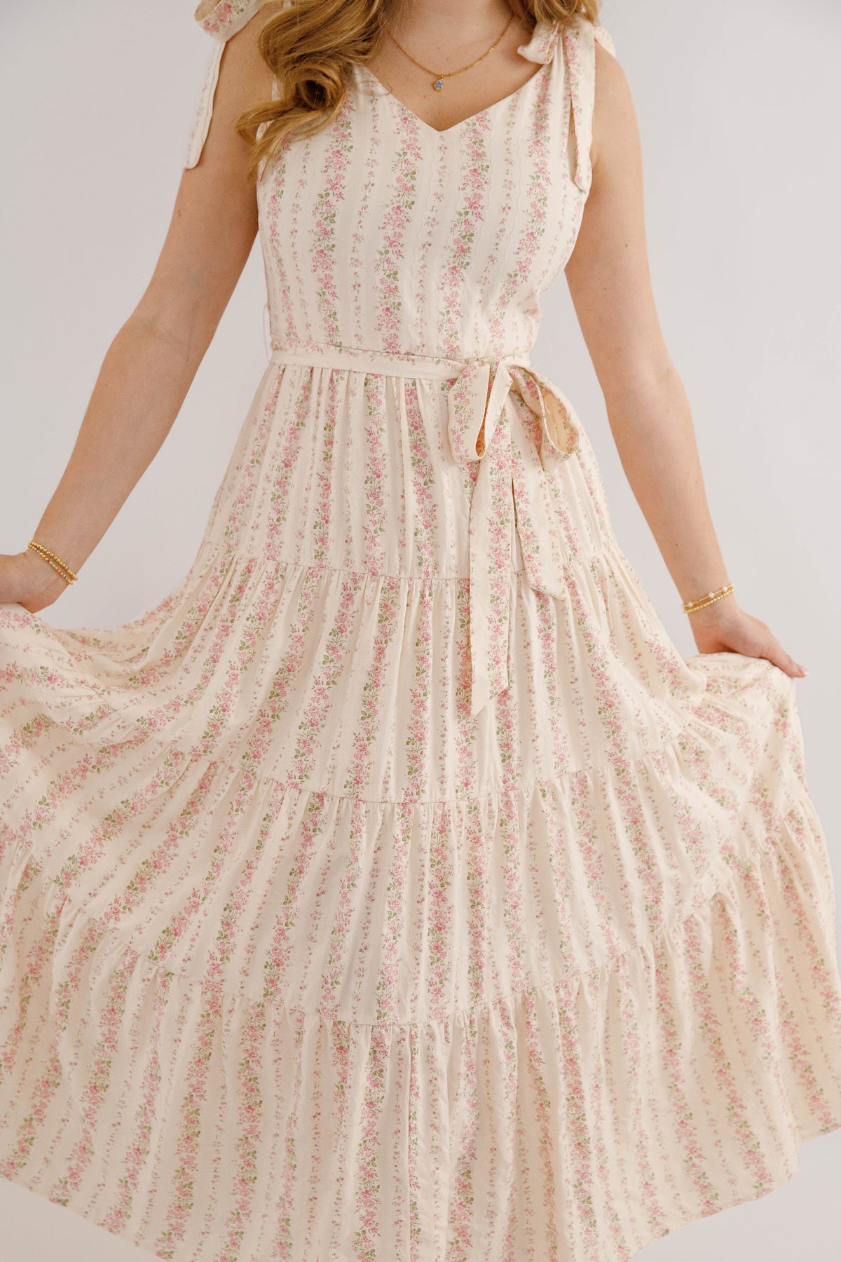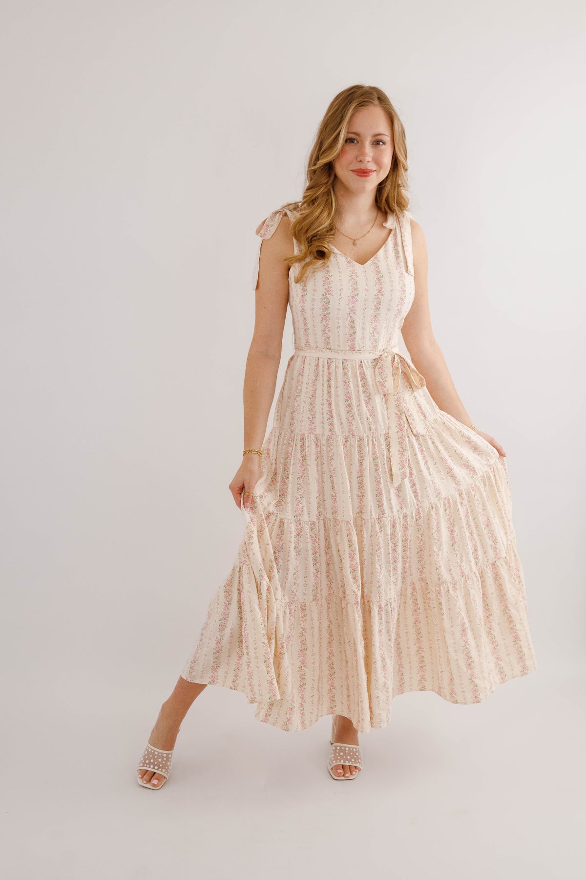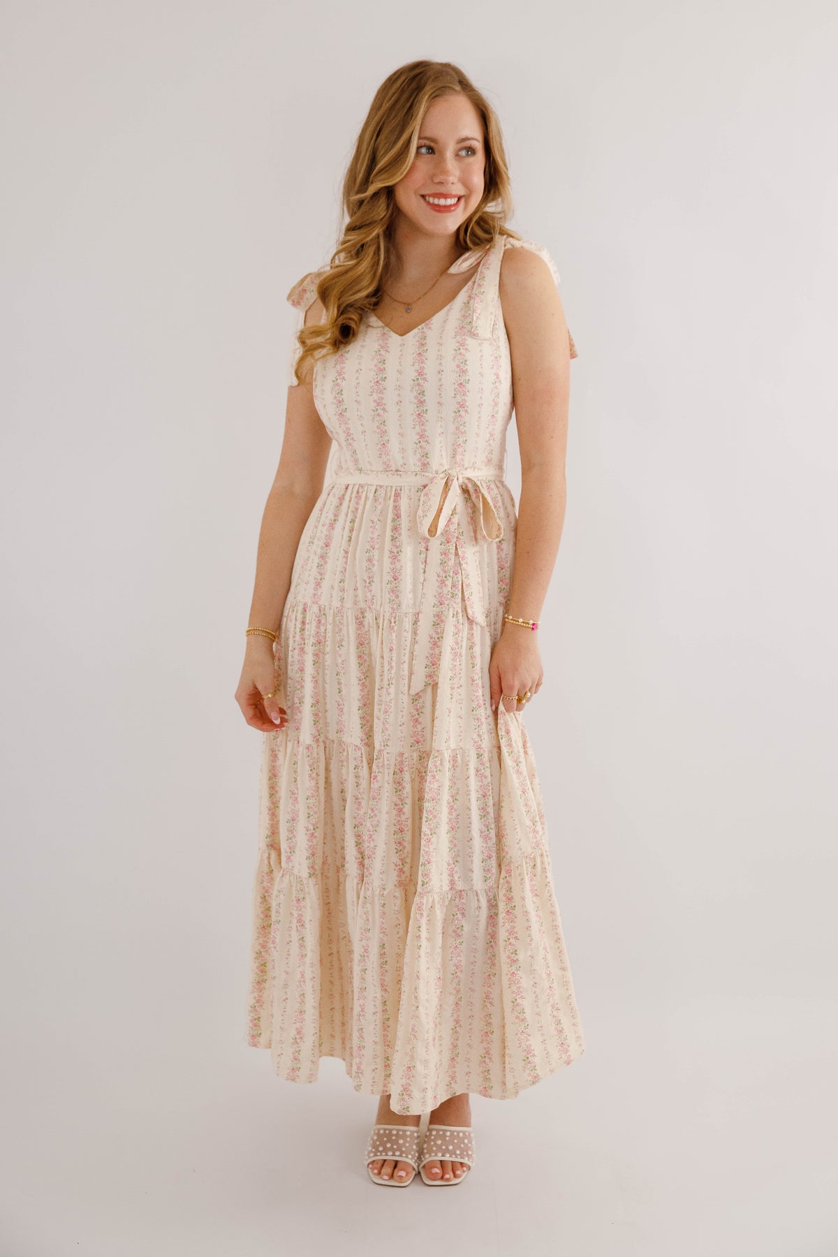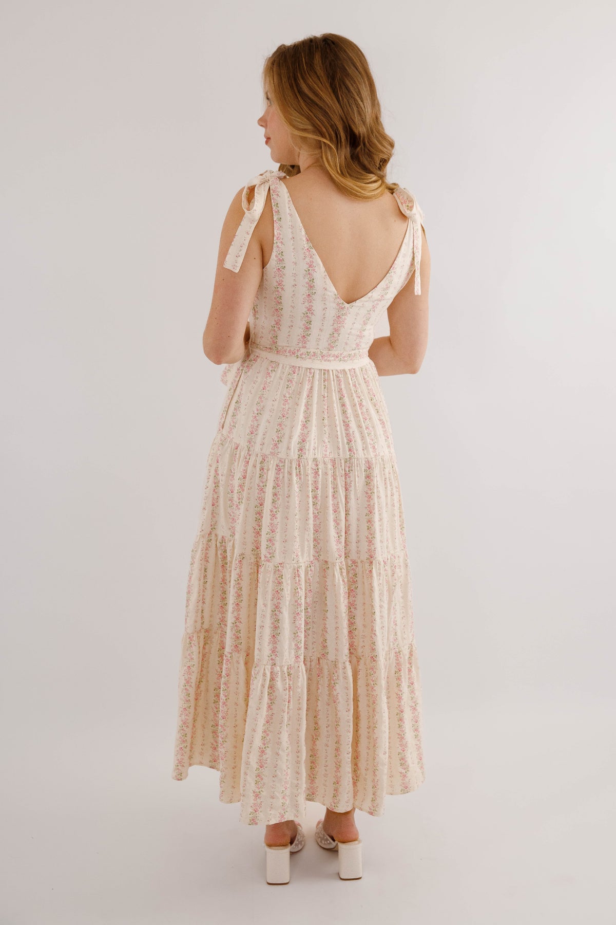 Embrace effortless spring style with this charming pink striped floral maxi dress. Featuring a romantic tiered skirt and adjustable tie straps, it offers a flattering silhouette enhanced by a cinched waist tie. The hidden side zipper ensures a seamless look, while the structured fabric provides a polished finish. Perfect for garden parties, weddings, or casual outings.